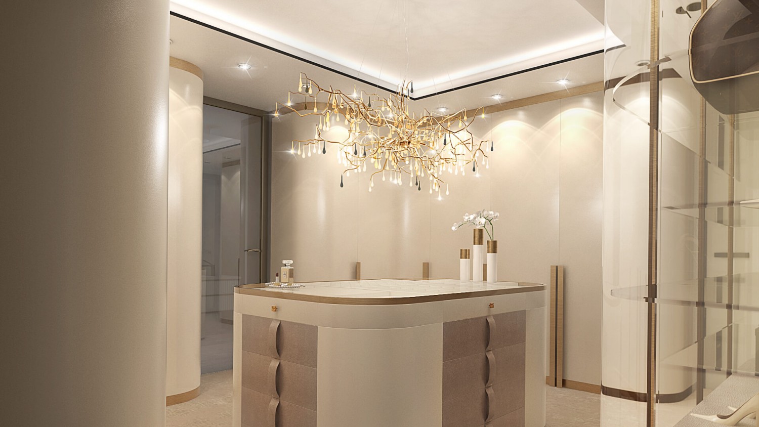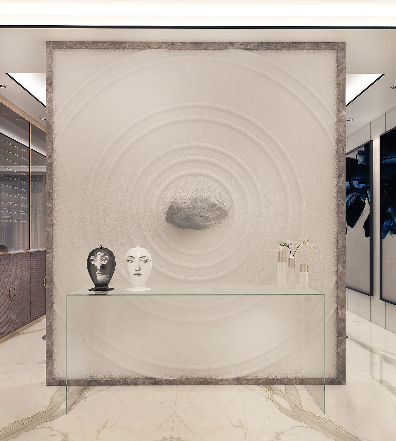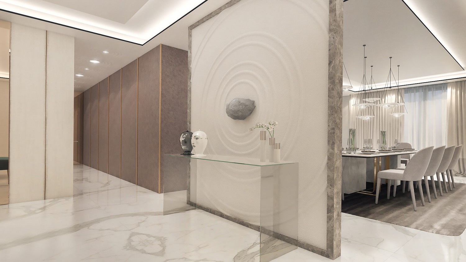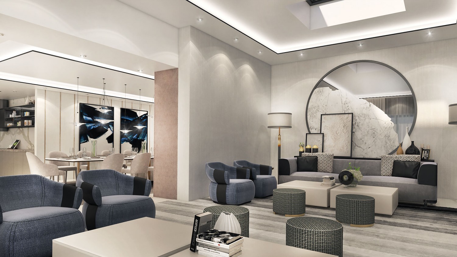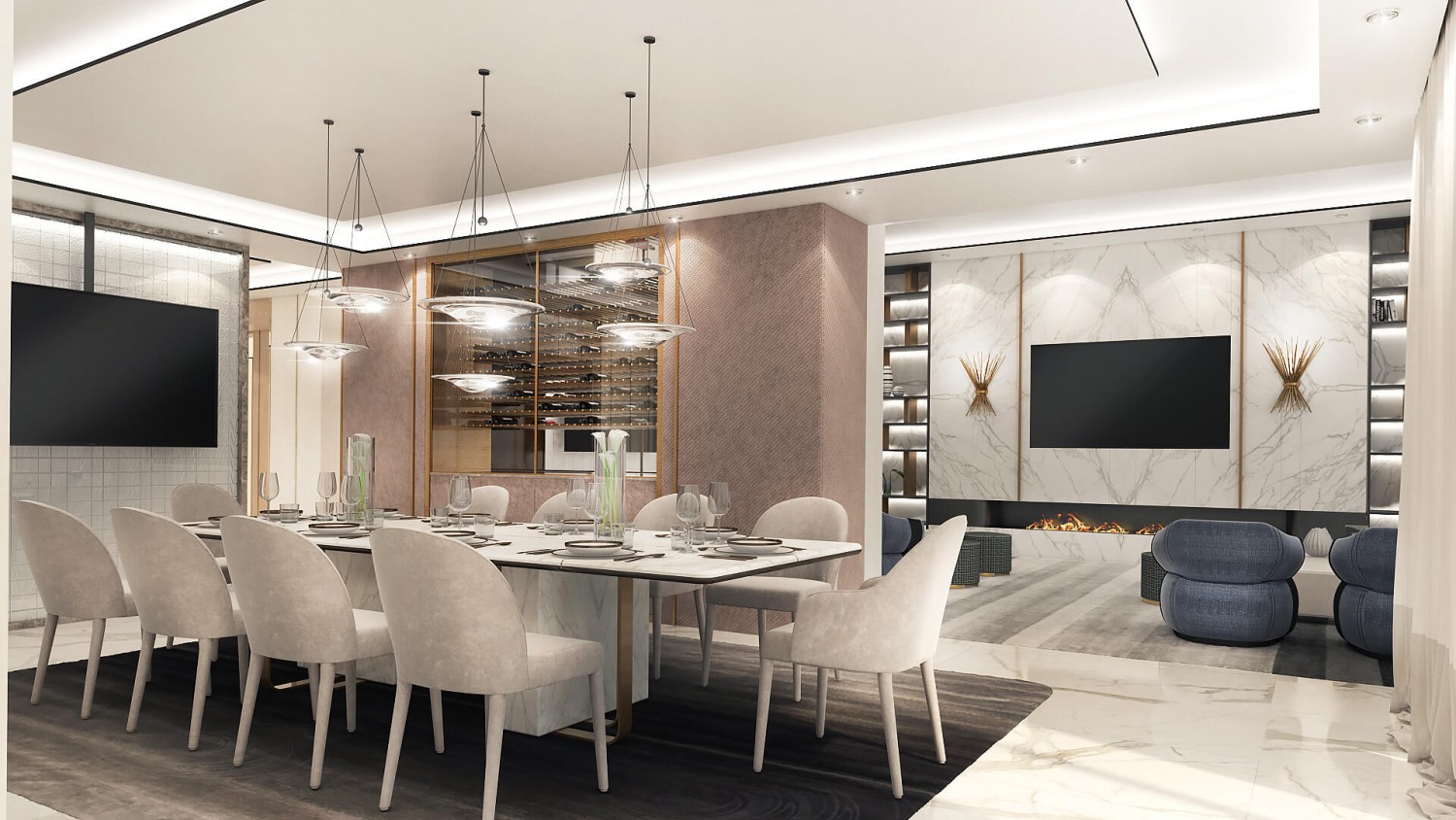 Концепцията започна с личната история на семейството и желанието им да вплетем хармония и лукс, което доведе до идеята да създадем тази уникална „дзен лукс” визия за бъдещия им дом. Цветовата палитра за този проект е семпла, тя се състои основно от нюансите на бежовото и сивото, които контрастират с дизайнерски решения в ярко синьо. Масивното осветление, копринените тапети и уникалните елементи, изработени по поръчка, подчертават съвършенството на пространството, осигурявайки чувство на динамика. Стилната комбинация от материали и текстури като естествен камък, кристални елементи, кадифе и полиран месинг, акцентира върху естествената светлина и създава приглушено усещане за лукс.
