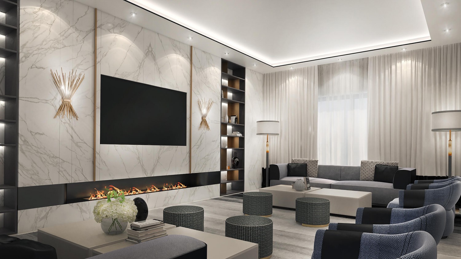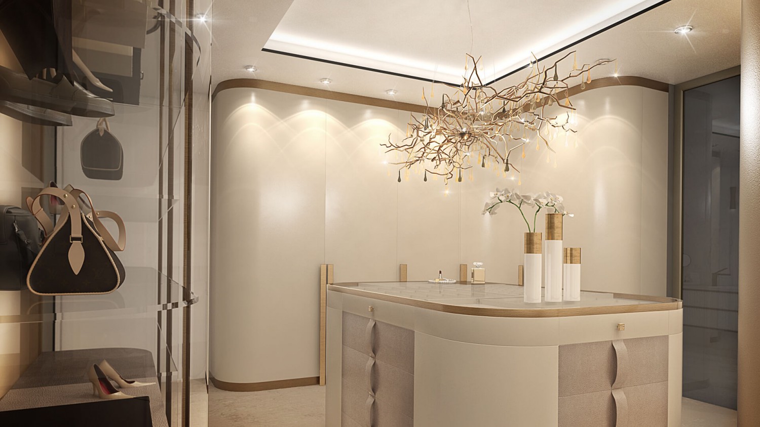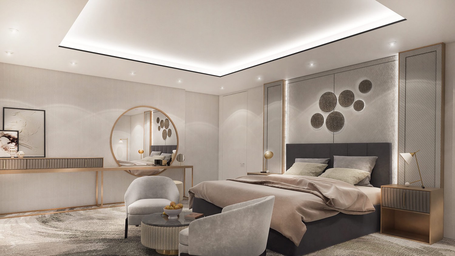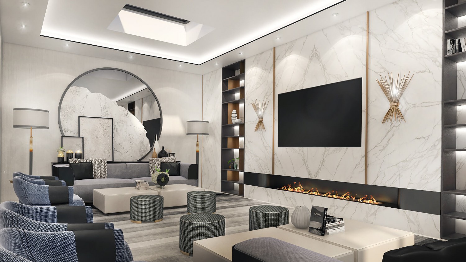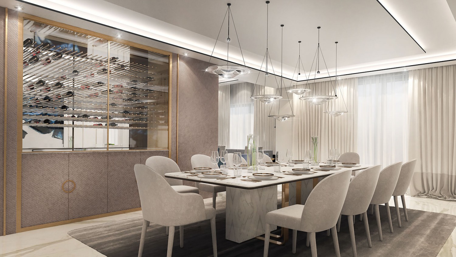 Концепцията започна с личната история на семейството и желанието им да вплетем хармония и лукс, което доведе до идеята да създадем тази уникална „дзен лукс” визия за бъдещия им дом. Цветовата палитра за този проект е семпла, тя се състои основно от нюансите на бежовото и сивото, които контрастират с дизайнерски решения в ярко синьо. Масивното осветление, копринените тапети и уникалните елементи, изработени по поръчка, подчертават съвършенството на пространството, осигурявайки чувство на динамика. Стилната комбинация от материали и текстури като естествен камък, кристални елементи, кадифе и полиран месинг, акцентира върху естествената светлина и създава приглушено усещане за лукс.