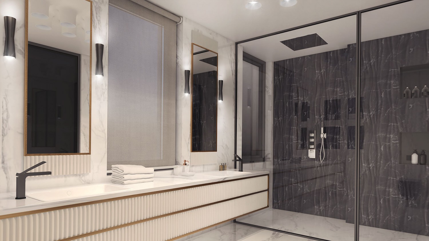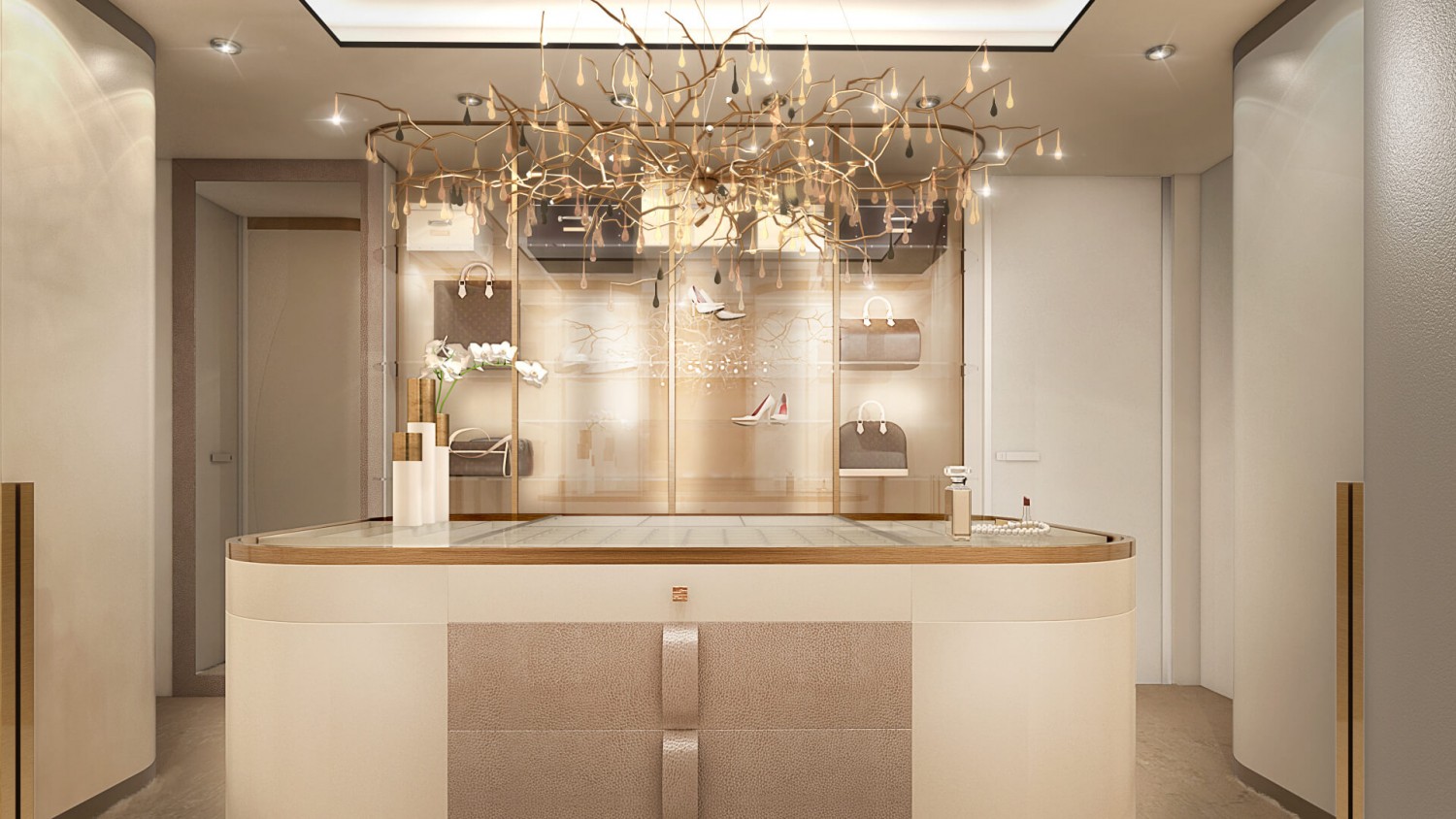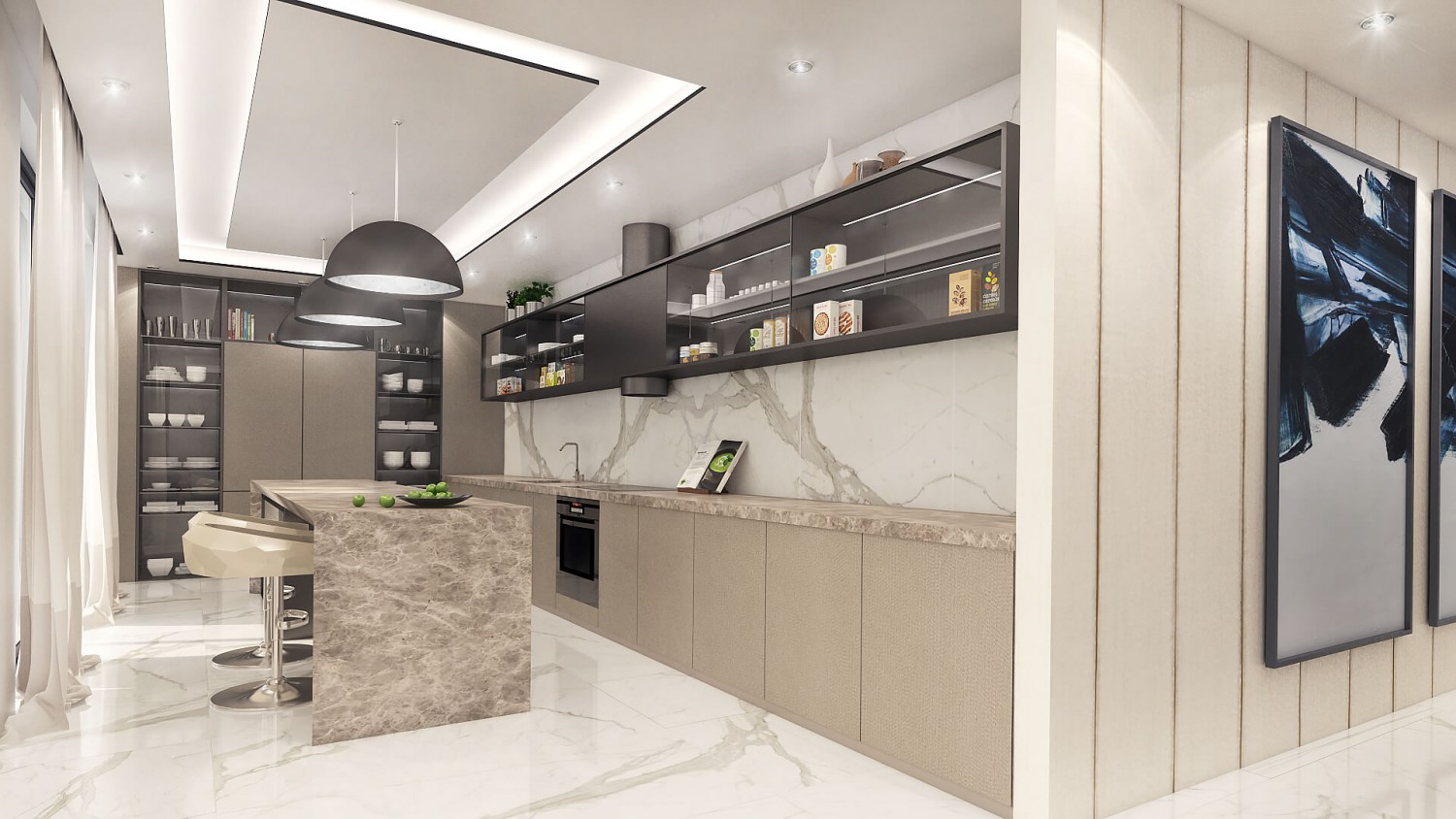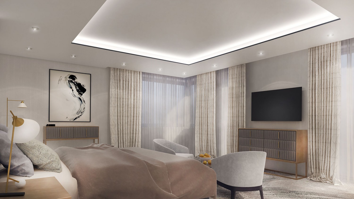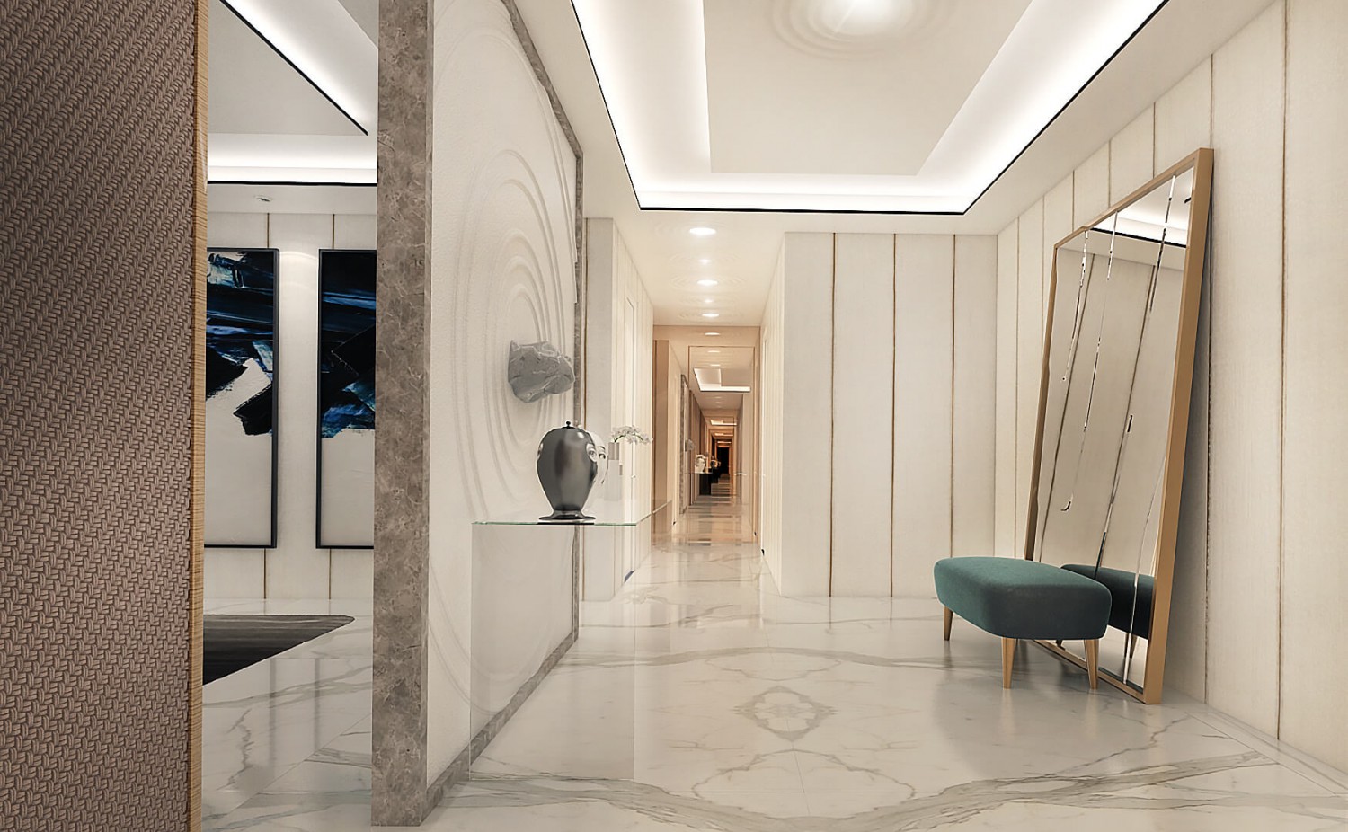 Концепцията започна с личната история на семейството и желанието им да вплетем хармония и лукс, което доведе до идеята да създадем тази уникална „дзен лукс” визия за бъдещия им дом. Цветовата палитра за този проект е семпла, тя се състои основно от нюансите на бежовото и сивото, които контрастират с дизайнерски решения в ярко синьо. Масивното осветление, копринените тапети и уникалните елементи, изработени по поръчка, подчертават съвършенството на пространството, осигурявайки чувство на динамика. Стилната комбинация от материали и текстури като естествен камък, кристални елементи, кадифе и полиран месинг, акцентира върху естествената светлина и създава приглушено усещане за лукс.