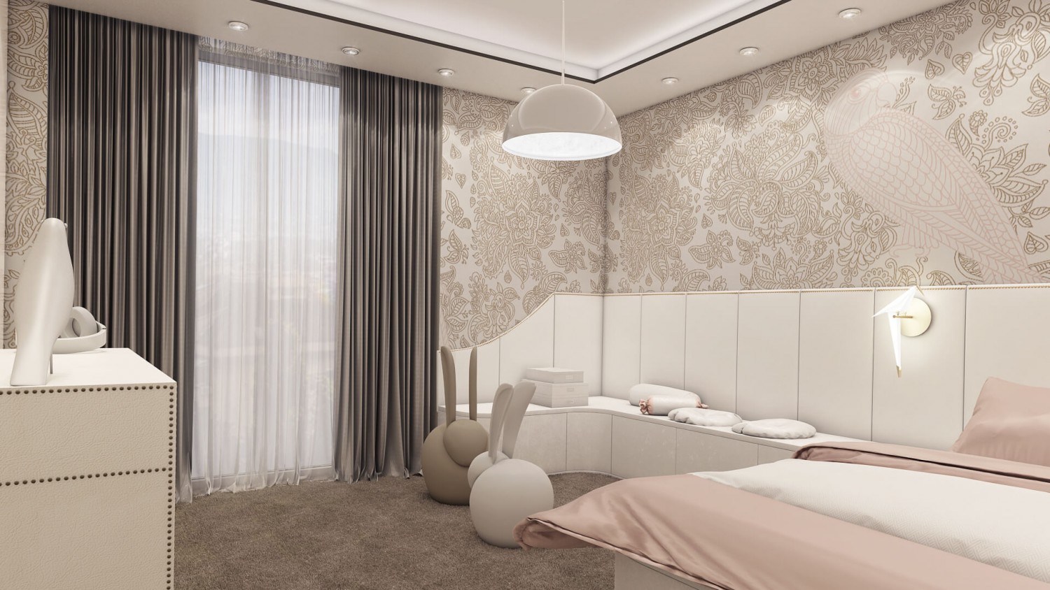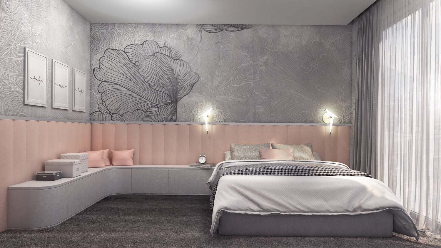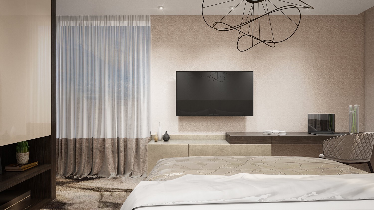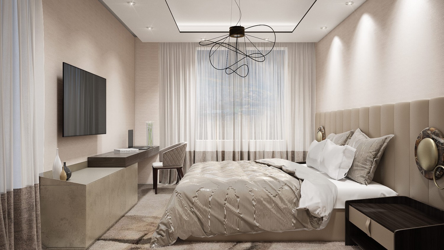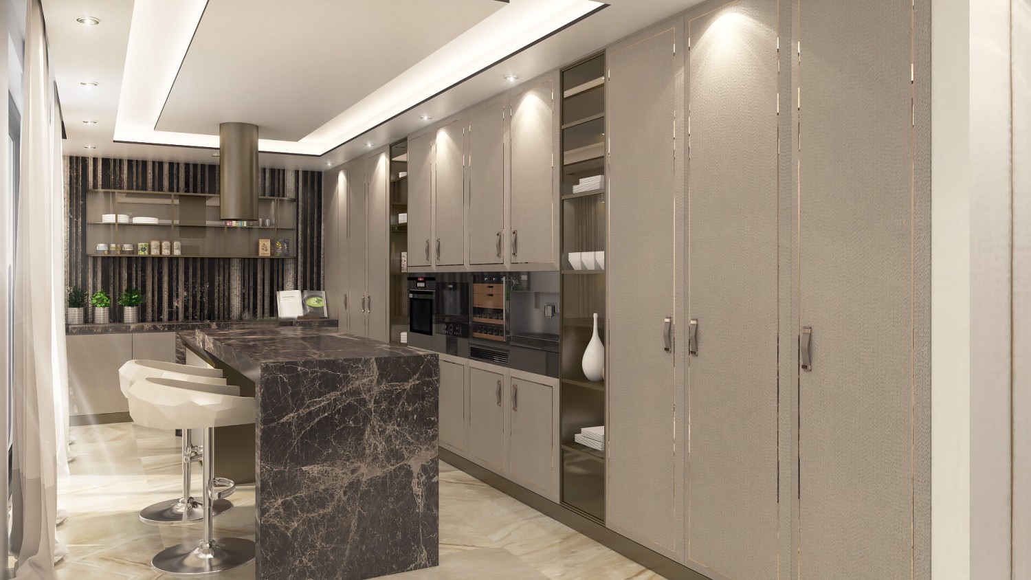 Концепцията започна с личната история на семейството и желанието им да вплетем хармония и лукс, което доведе до идеята да създадем тази уникална „дзен лукс” визия за бъдещия им дом. Цветовата палитра за този проект е семпла, тя се състои основно от нюансите на бежовото и сивото, които контрастират с дизайнерски решения в ярко синьо. Масивното осветление, копринените тапети и уникалните елементи, изработени по поръчка, подчертават съвършенството на пространството, осигурявайки чувство на динамика. Стилната комбинация от материали и текстури като естествен камък, кристални елементи, кадифе и полиран месинг, акцентира върху естествената светлина и създава приглушено усещане за лукс.